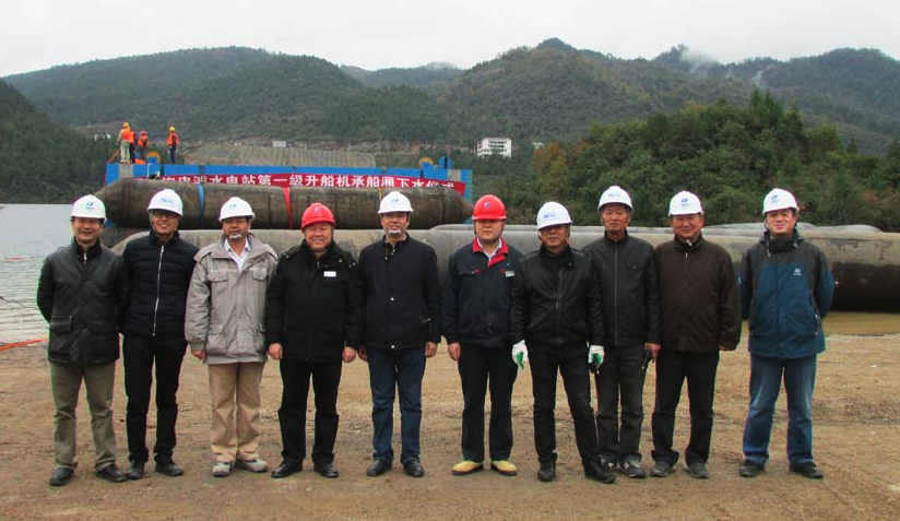 構(gòu)皮灘一級(jí)升船機(jī)承船廂構(gòu)皮灘通航工程是當(dāng)今世界通航水頭最高、單級(jí)提升高度最大、主提升設(shè)備規(guī)模最大的通航建筑物。為此公司董事長(zhǎng)徐學(xué)明親自?huà)鞄洠诠绢I(lǐng)導(dǎo)和相關(guān)部門(mén)的大力支持下,克服了現(xiàn)場(chǎng)施工的種種困難,加班加點(diǎn)按原定計(jì)劃完成結(jié)構(gòu)制作;項(xiàng)目部根據(jù)現(xiàn)場(chǎng)有限的條件精心組織、科學(xué)決策,克服烏江流域內(nèi)沒(méi)有專(zhuān)用拖帶船、在沒(méi)有可供借鑒的案例情況下,編制了詳盡的氣囊下水方案、船廂拖帶方案、各工況下的安全評(píng)估報(bào)告和應(yīng)急預(yù)案, 從而保證了承船廂平穩(wěn)入水、安全進(jìn)入船廂室。